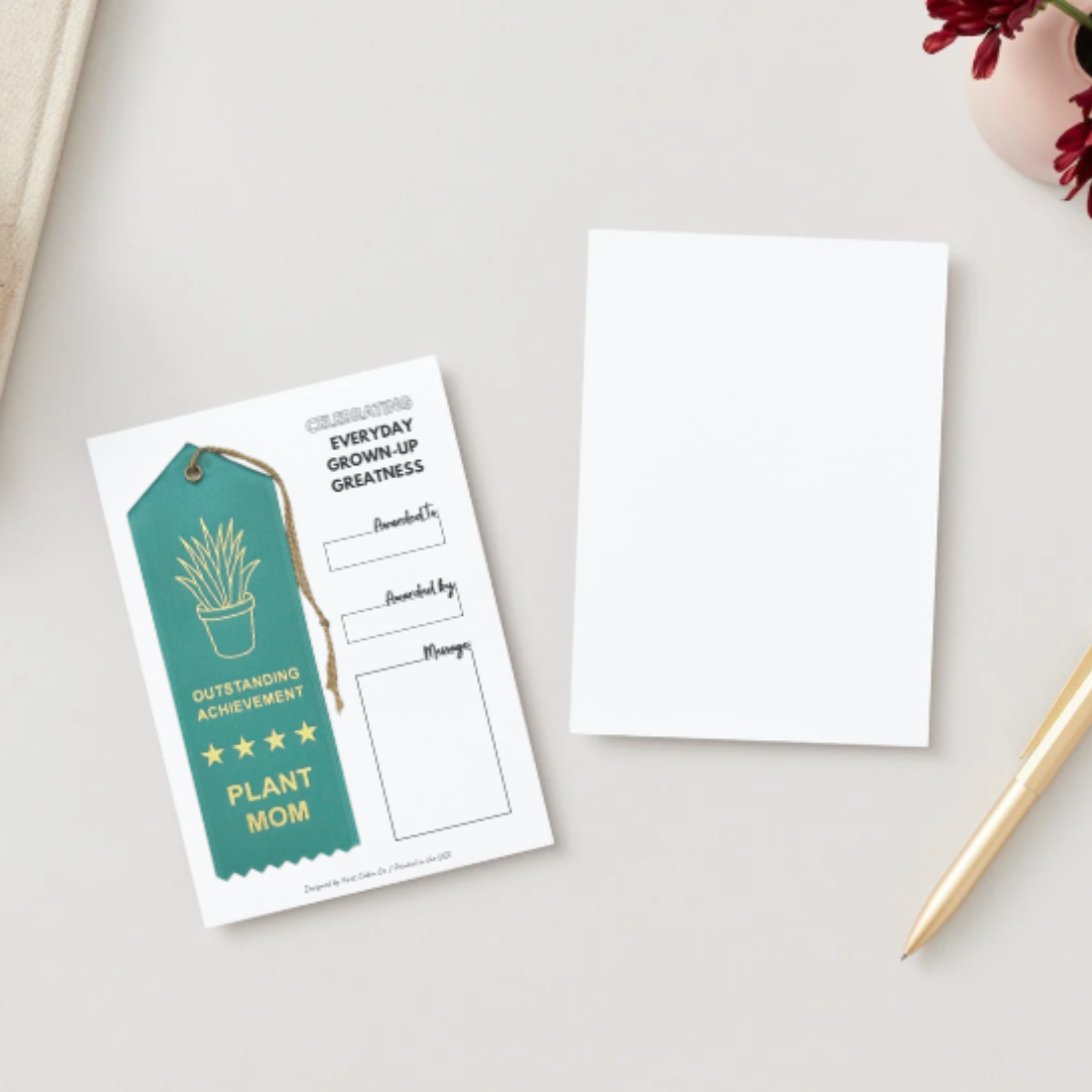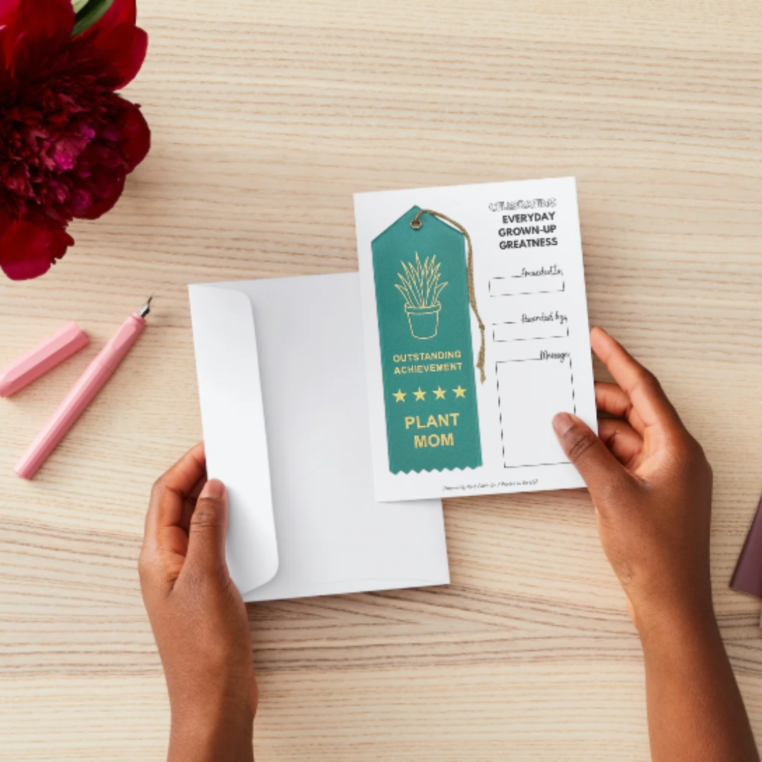 Like the ribbons you remember receiving as a kid, but cooler and made for adults participating in life. 2 x 6" custom peaked ribbon finished with an event card for celebrating when you are someone obsessed with plants, who is an awesome plant mom or can't stop buying plants.