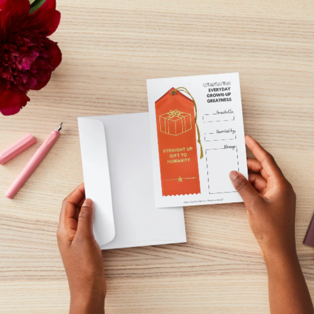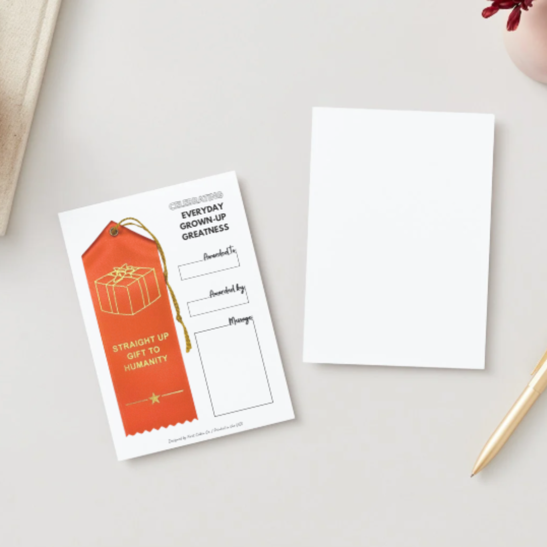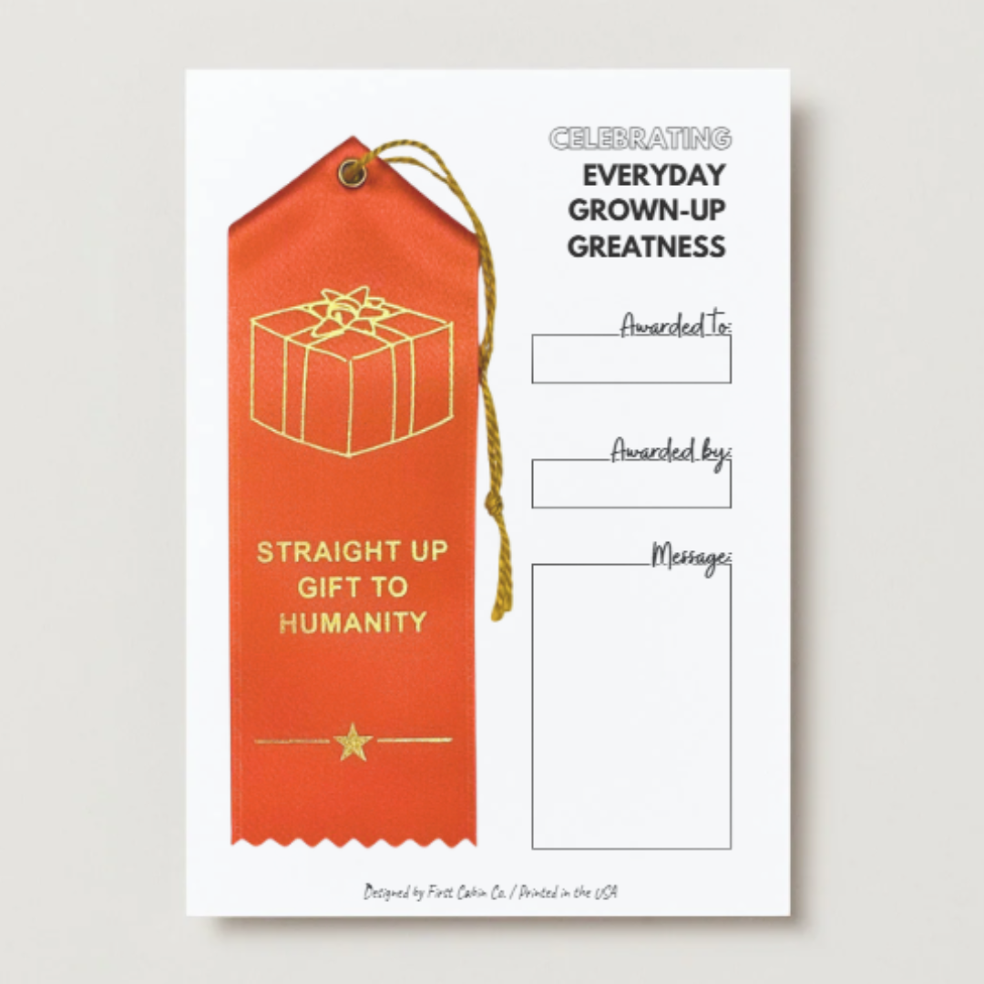 Like the ribbons you remember receiving as a kid, but cooler and made for adults participating in life. 2 x 6" custom peaked ribbon finished with an event card for celebrating a friend, family member, or coworker who is a straight-up gift to humanity.