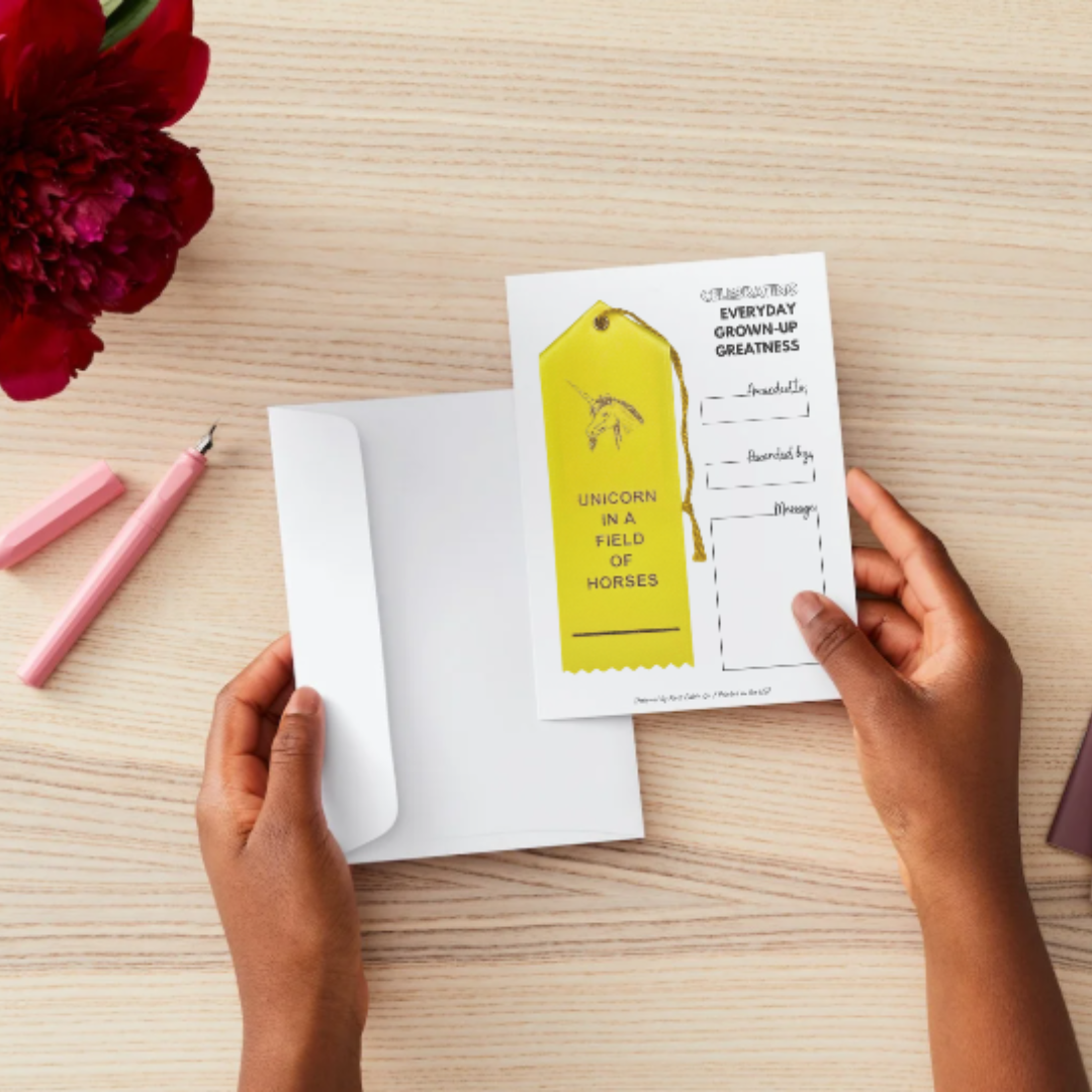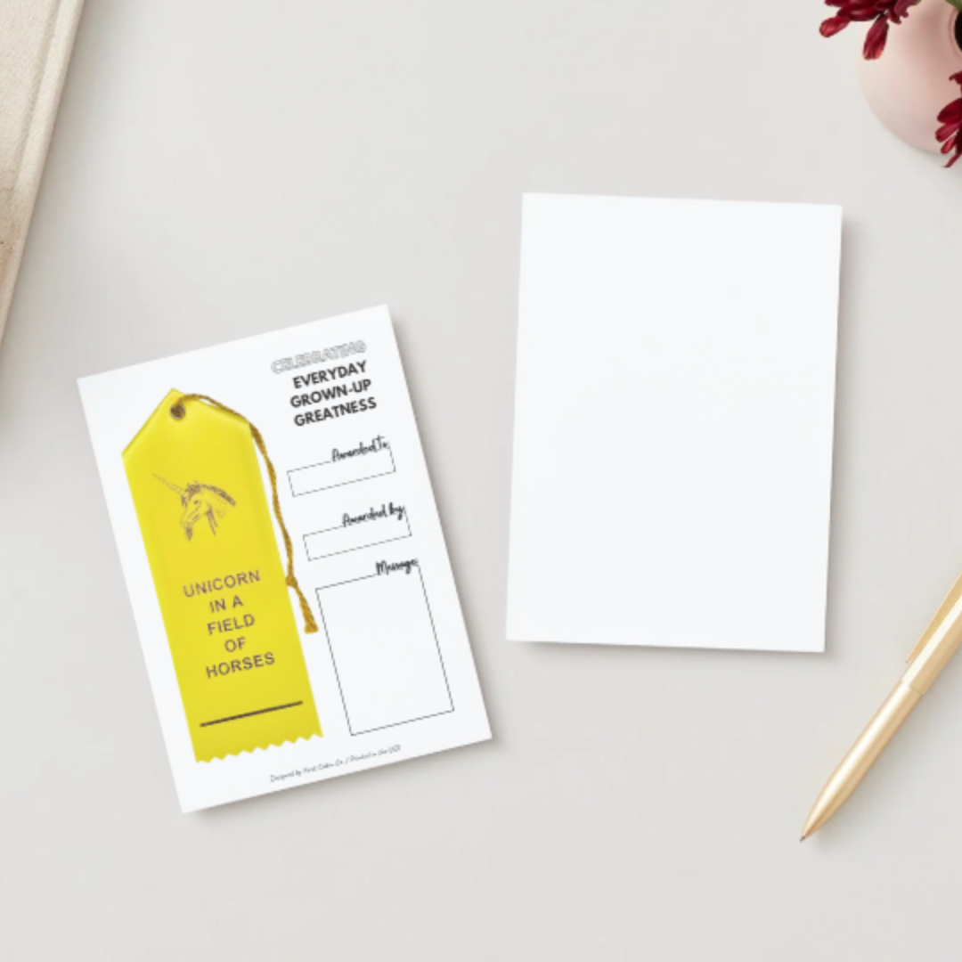Like the ribbons you remember receiving as a kid, but cooler and made for adults participating in life. 2 x 6" custom peaked ribbon finished with an event card for celebrating a friend, family member, or coworker who is a magical unicorn amongst a field of horses.