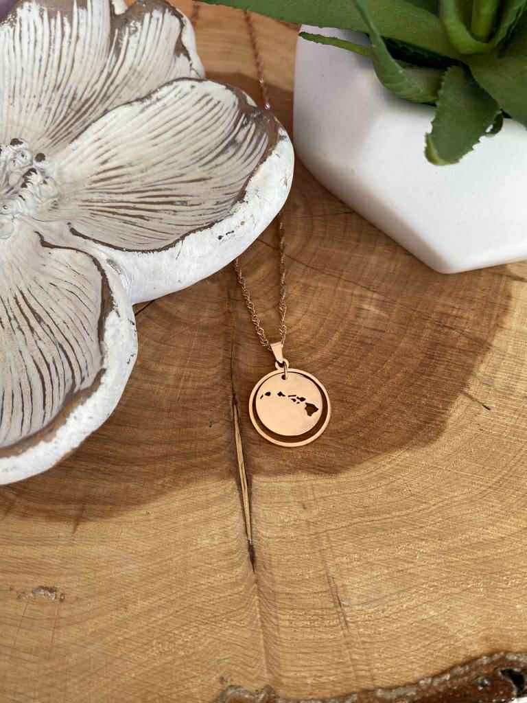 A stunning Hawaii state-shaped circle pendant paired with an elegant spiral-patterned chain, both the chain and pendant come in matching colors of your choice, creating a beautifully cohesive and customizable accessory complementing both dressy and casual looks. Thoughtfully designed to be truly unique, this piece symbolizes your nationality, culture, or even a place that holds a special place in your heart.