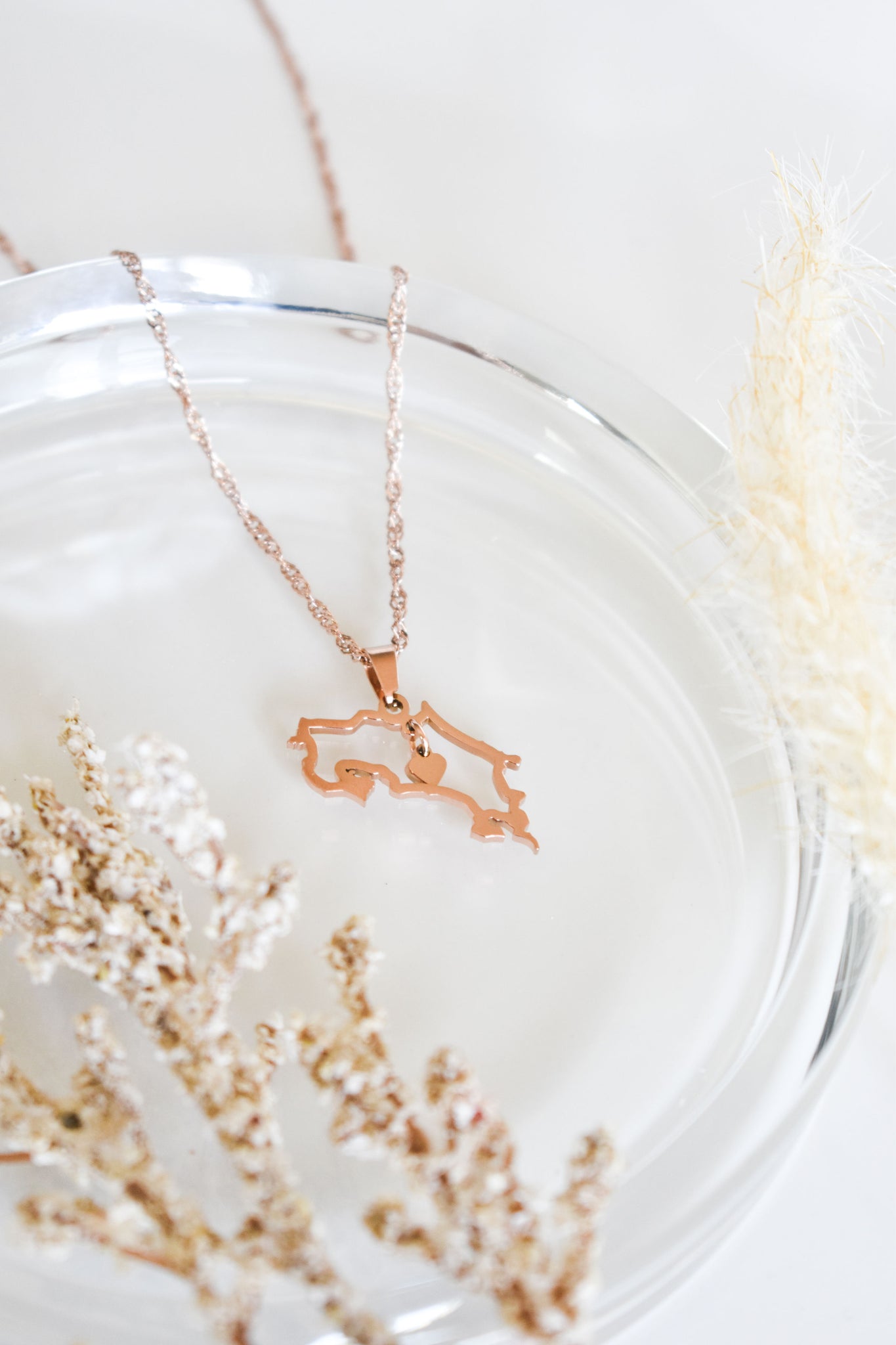 A stunning Costa Rica country-shaped outline pendant featuring a delicate, dangling heart at its center. Paired with an elegant spiral-patterned chain, both the chain and pendant come in matching colors of your choice, creating a beautifully cohesive and customizable accessory complementing both dressy and casual looks. Thoughtfully designed to be truly unique, this piece symbolizes your nationality, culture, or even a place that holds a special place in your heart.