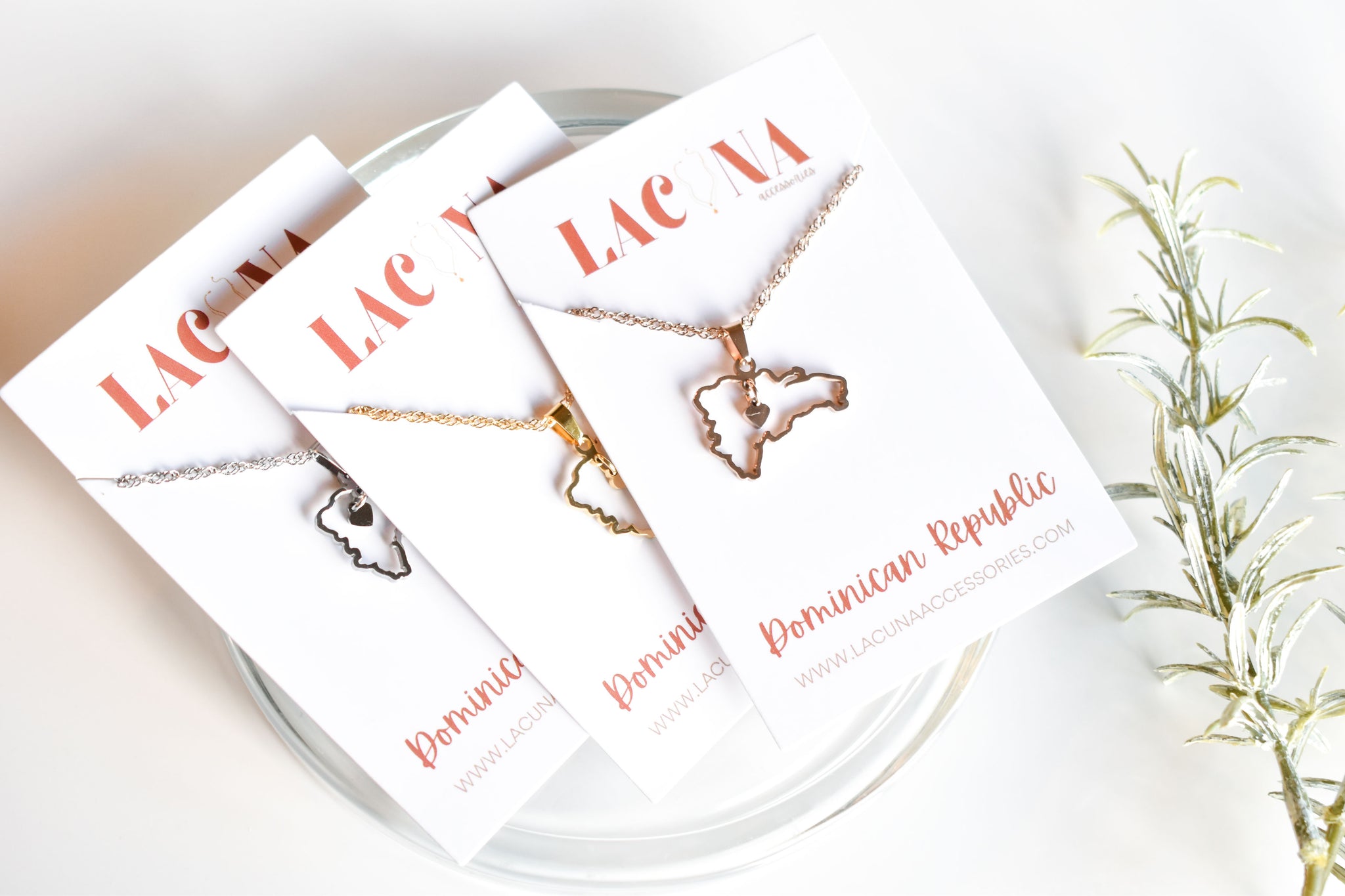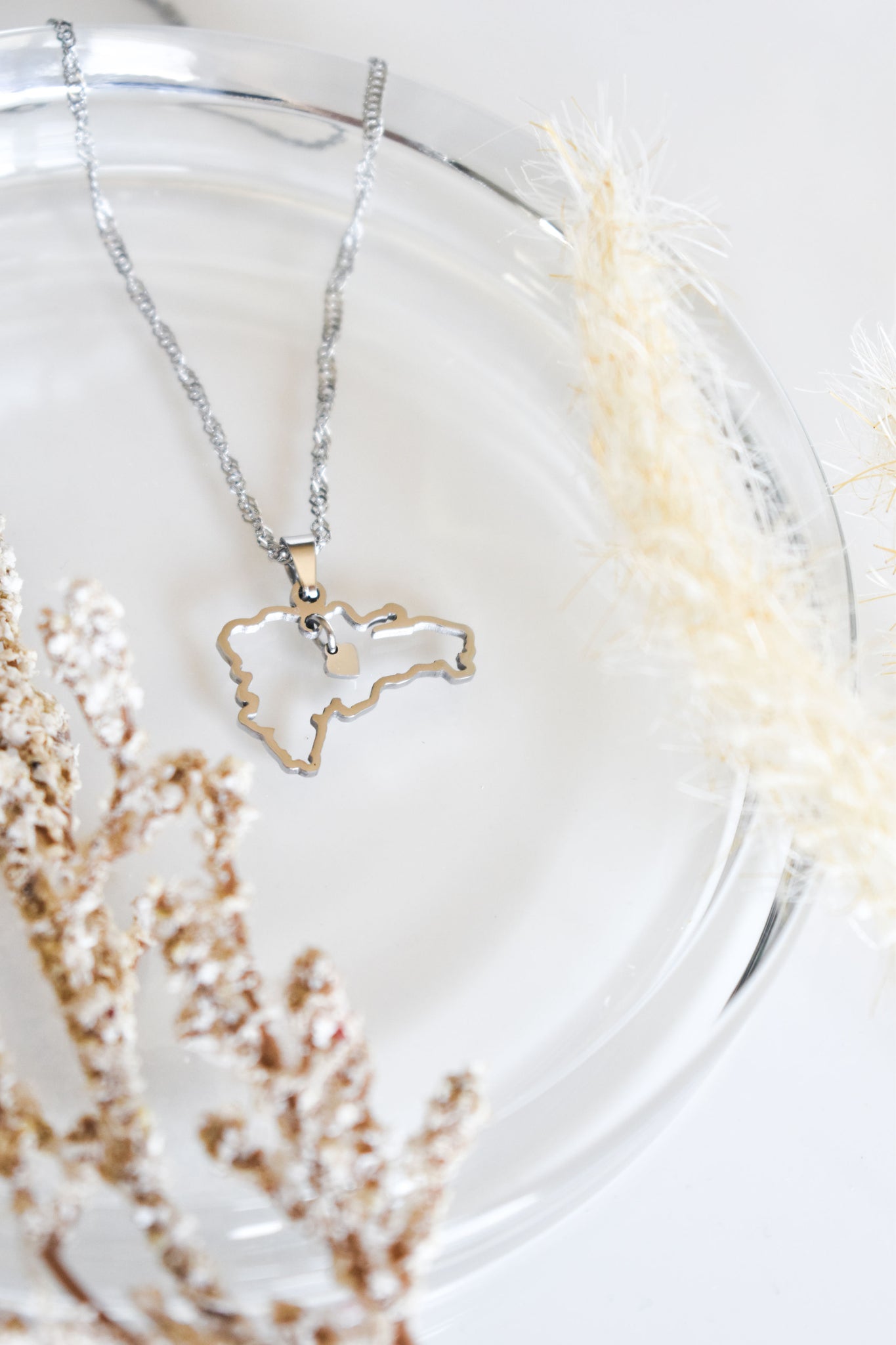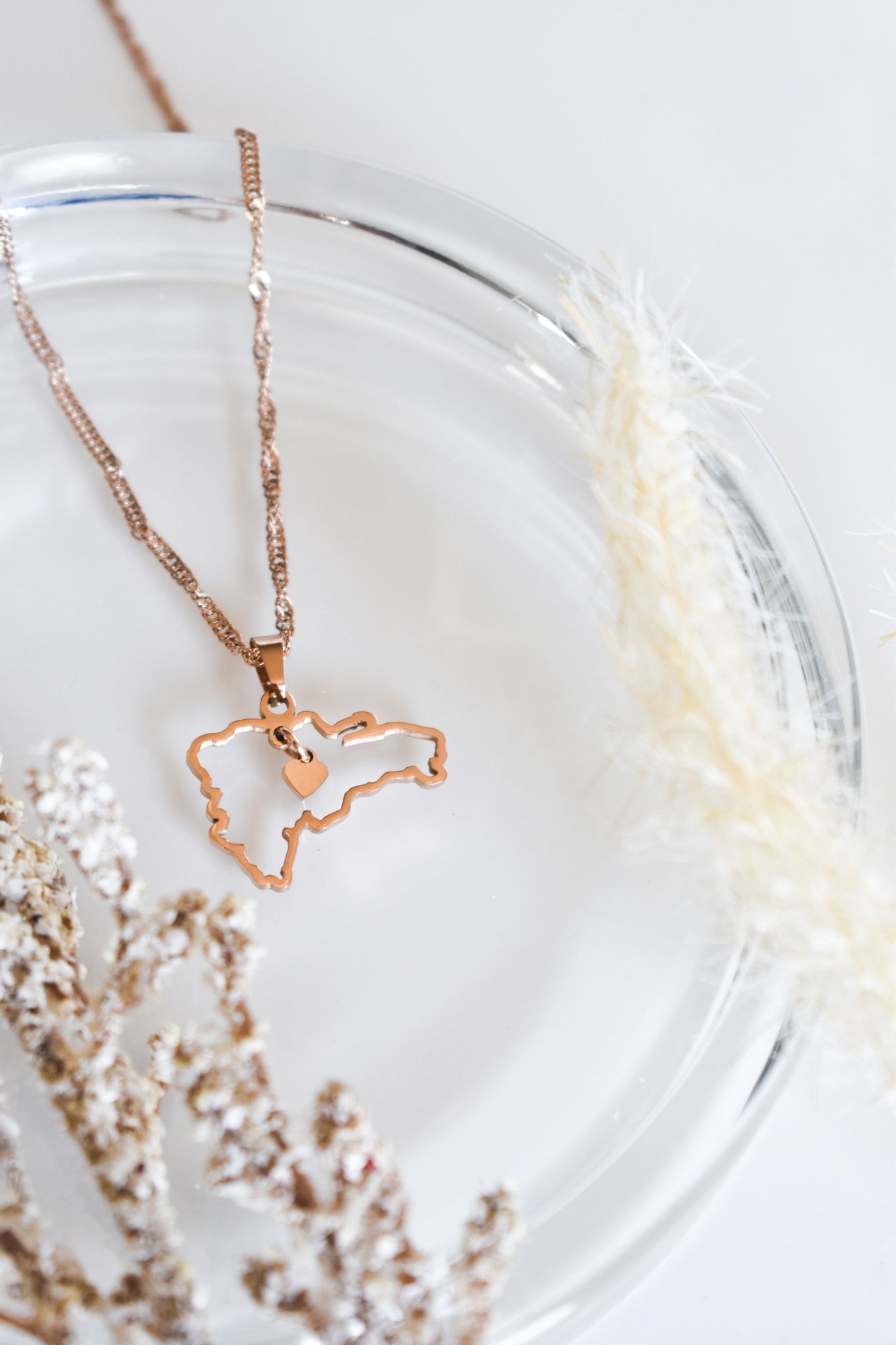 A stunning Dominican Republic country-shaped outline pendant featuring a delicate, dangling heart at its center. Paired with an elegant spiral-patterned chain, both the chain and pendant come in matching colors of your choice, creating a beautifully cohesive and customizable accessory complementing both dressy and casual looks. Thoughtfully designed to be truly unique, this piece symbolizes your nationality, culture, or even a place that holds a special place in your heart.