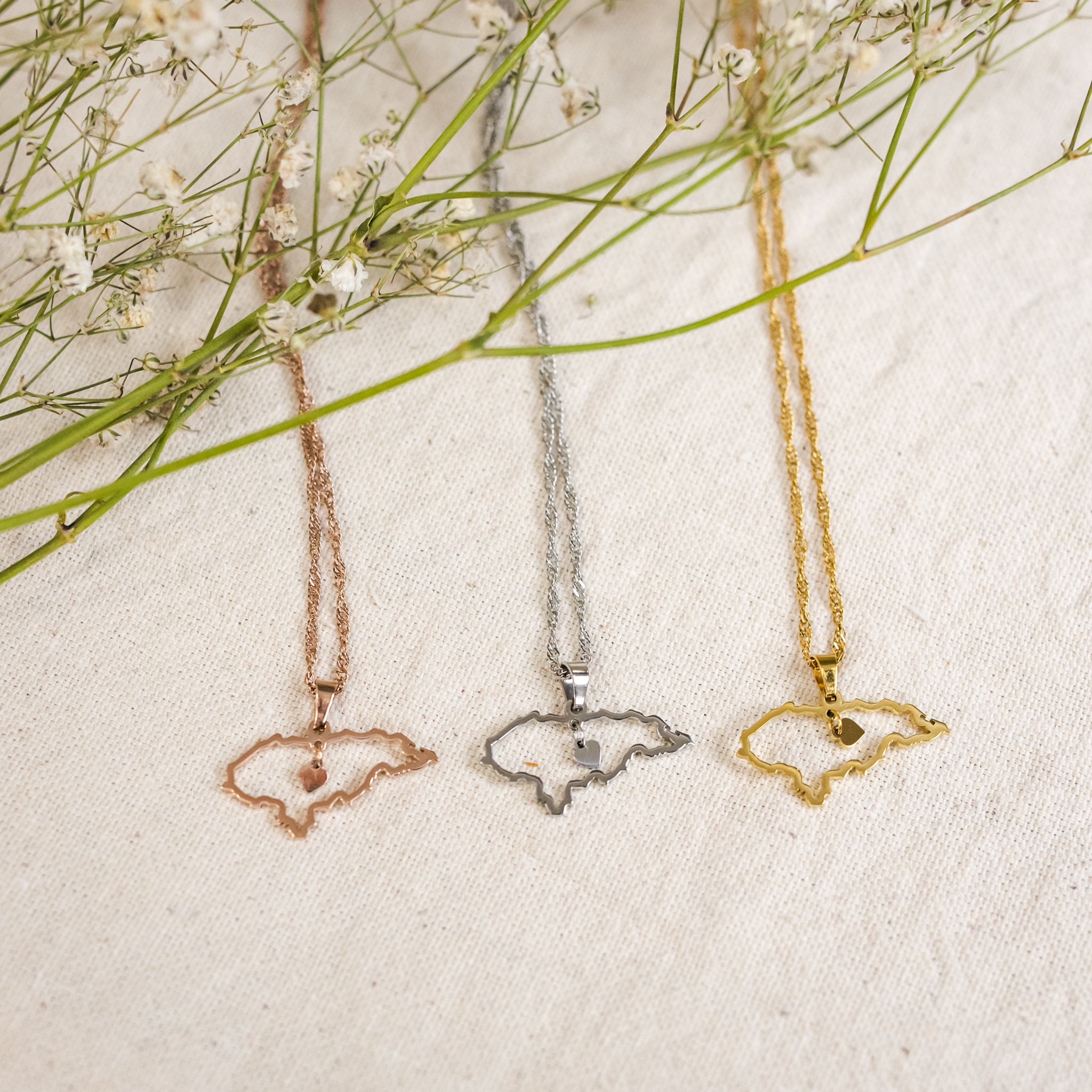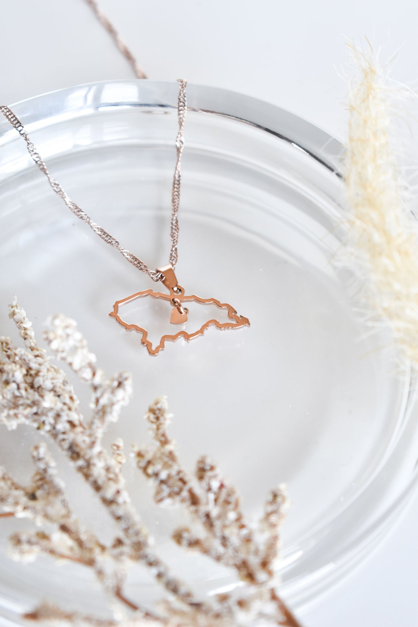 A stunning Honduras country-shaped outline pendant featuring a delicate, dangling heart at its center. Paired with an elegant spiral-patterned chain, both the chain and pendant come in matching colors of your choice, creating a beautifully cohesive and customizable accessory complementing both dressy and casual looks. Thoughtfully designed to be truly unique, this piece symbolizes your nationality, culture, or even a place that holds a special place in your heart.