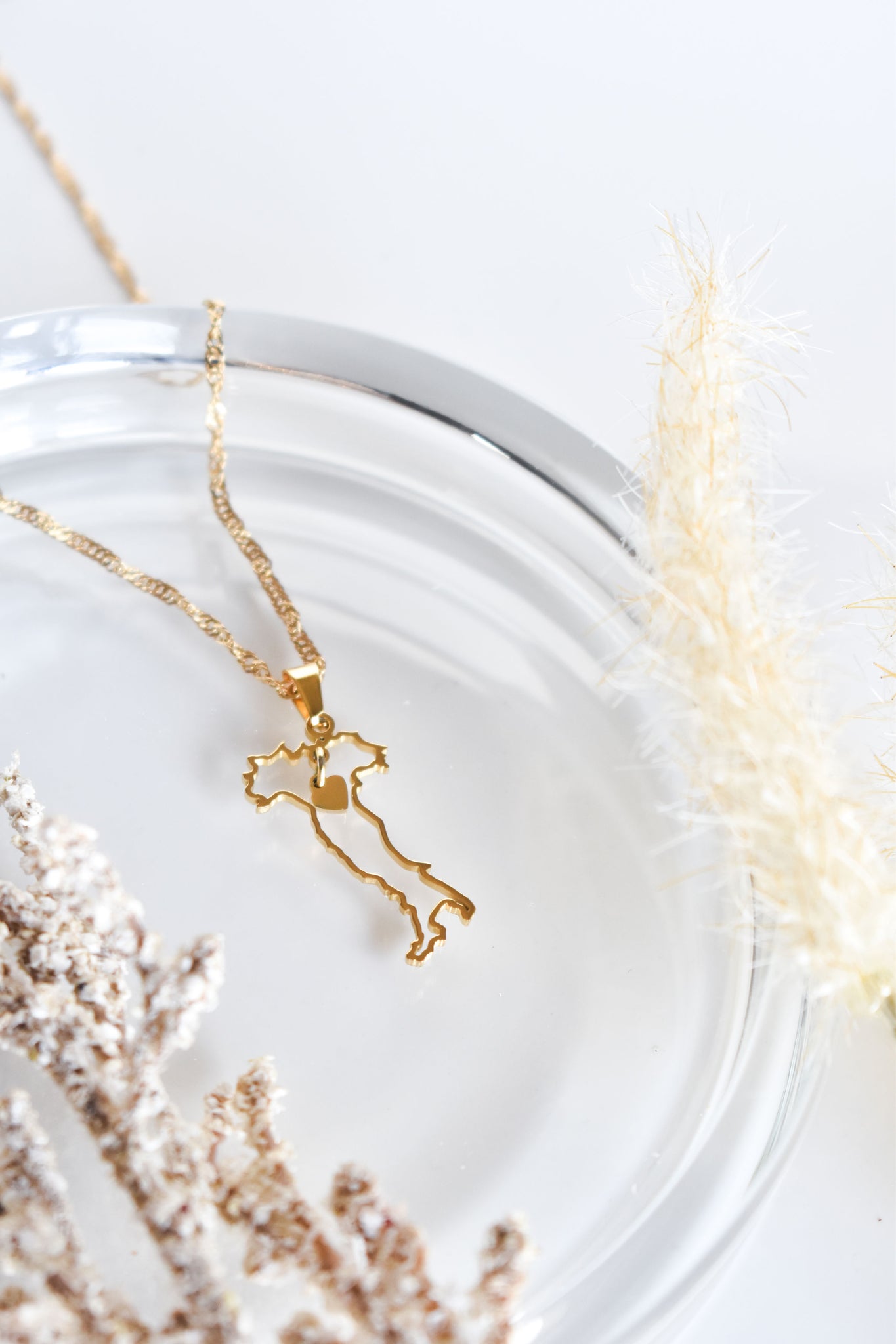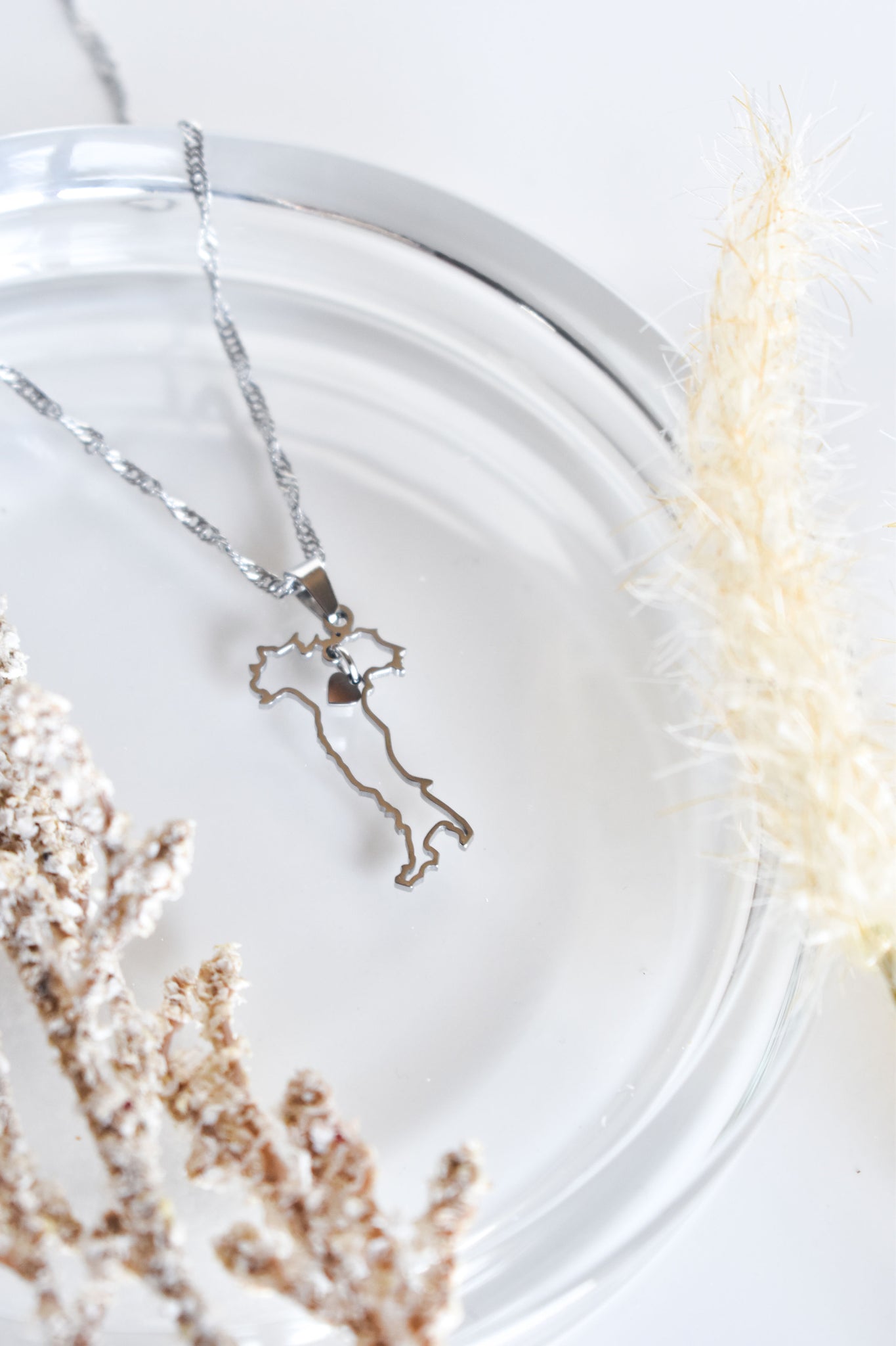 A stunning Italy country-shaped outline pendant featuring a delicate, dangling heart at its center. Paired with an elegant spiral-patterned chain, both the chain and pendant come in matching colors of your choice, creating a beautifully cohesive and customizable accessory complementing both dressy and casual looks. Thoughtfully designed to be truly unique, this piece symbolizes your nationality, culture, or even a place that holds a special place in your heart.