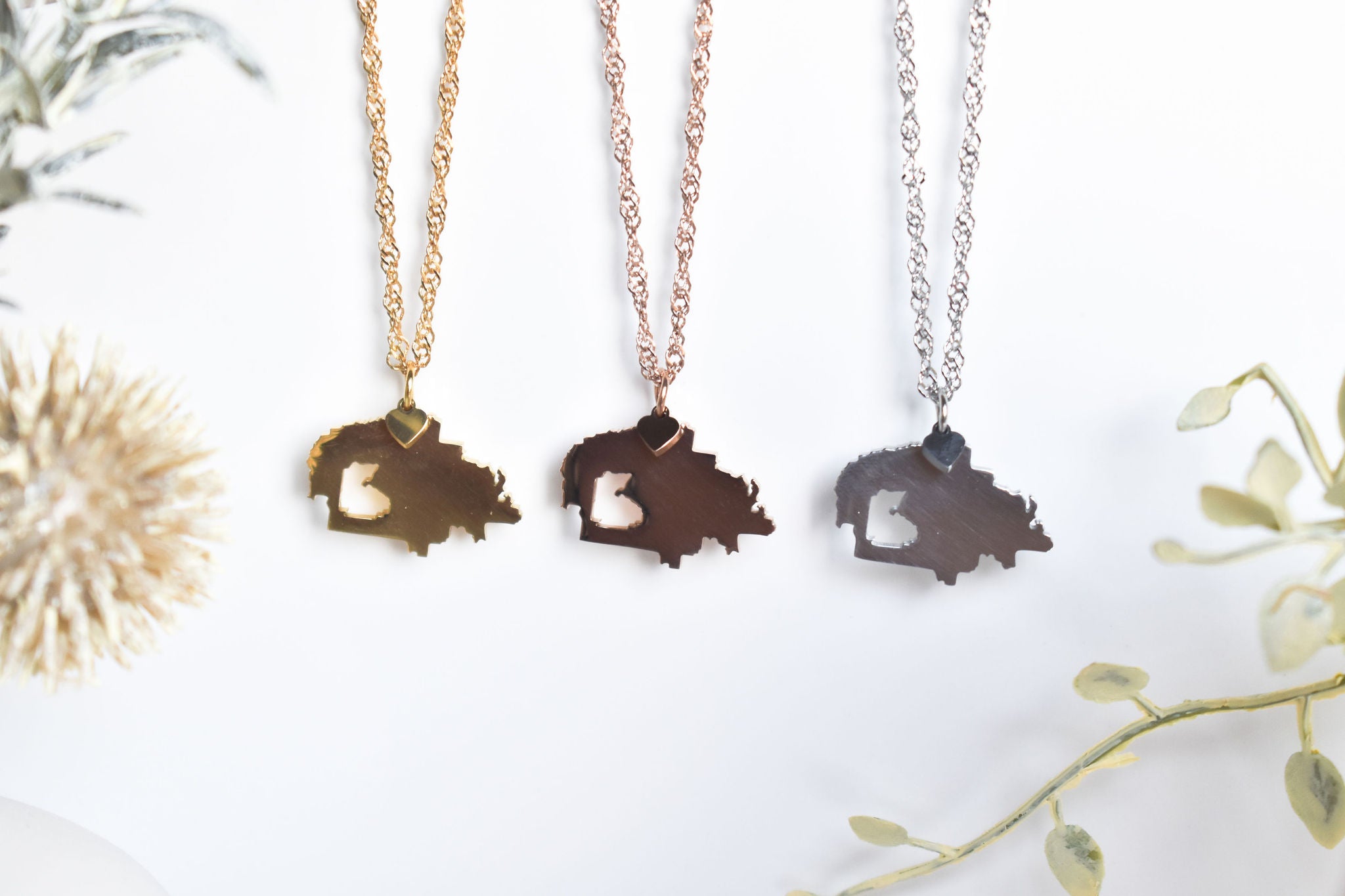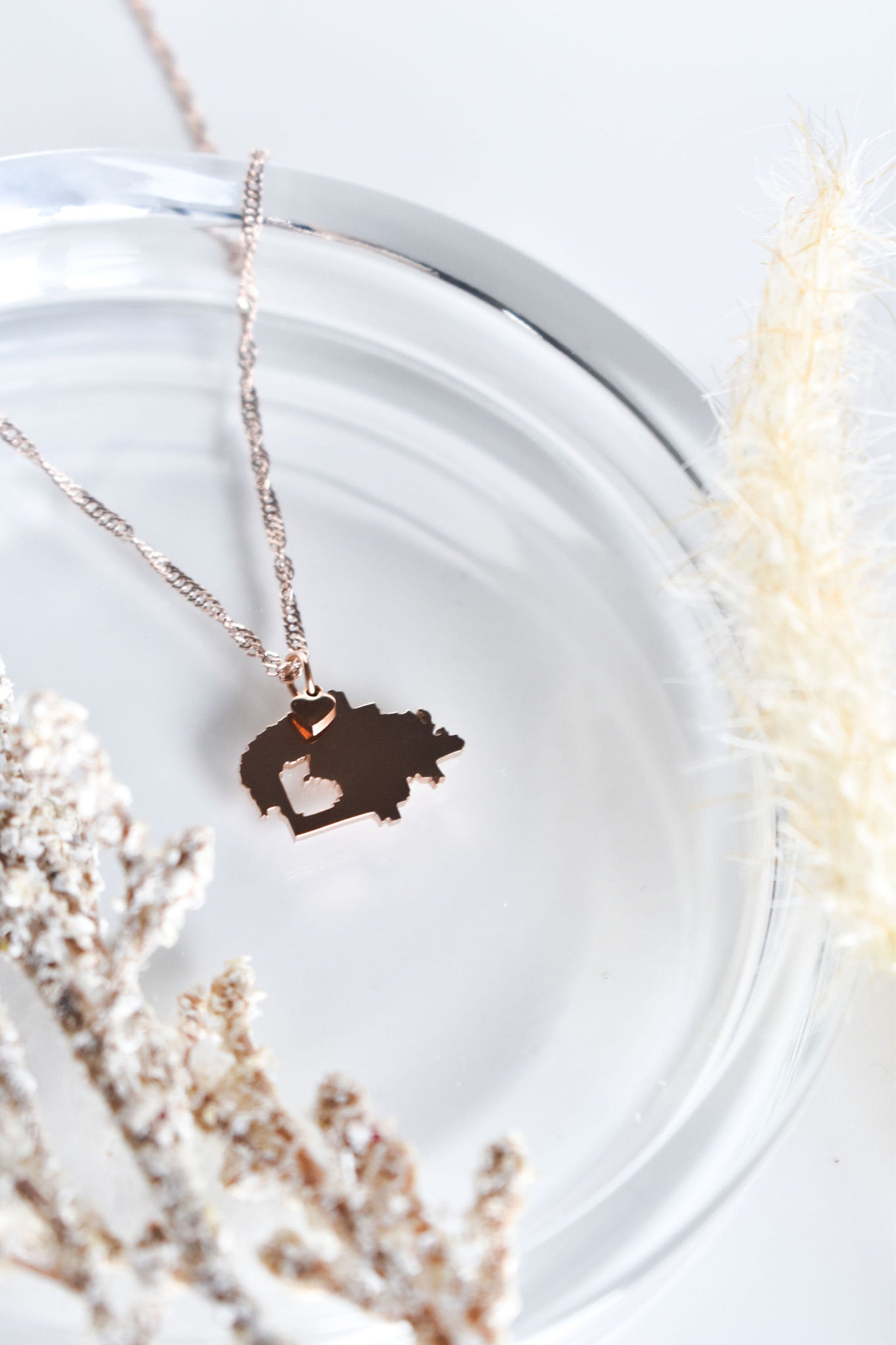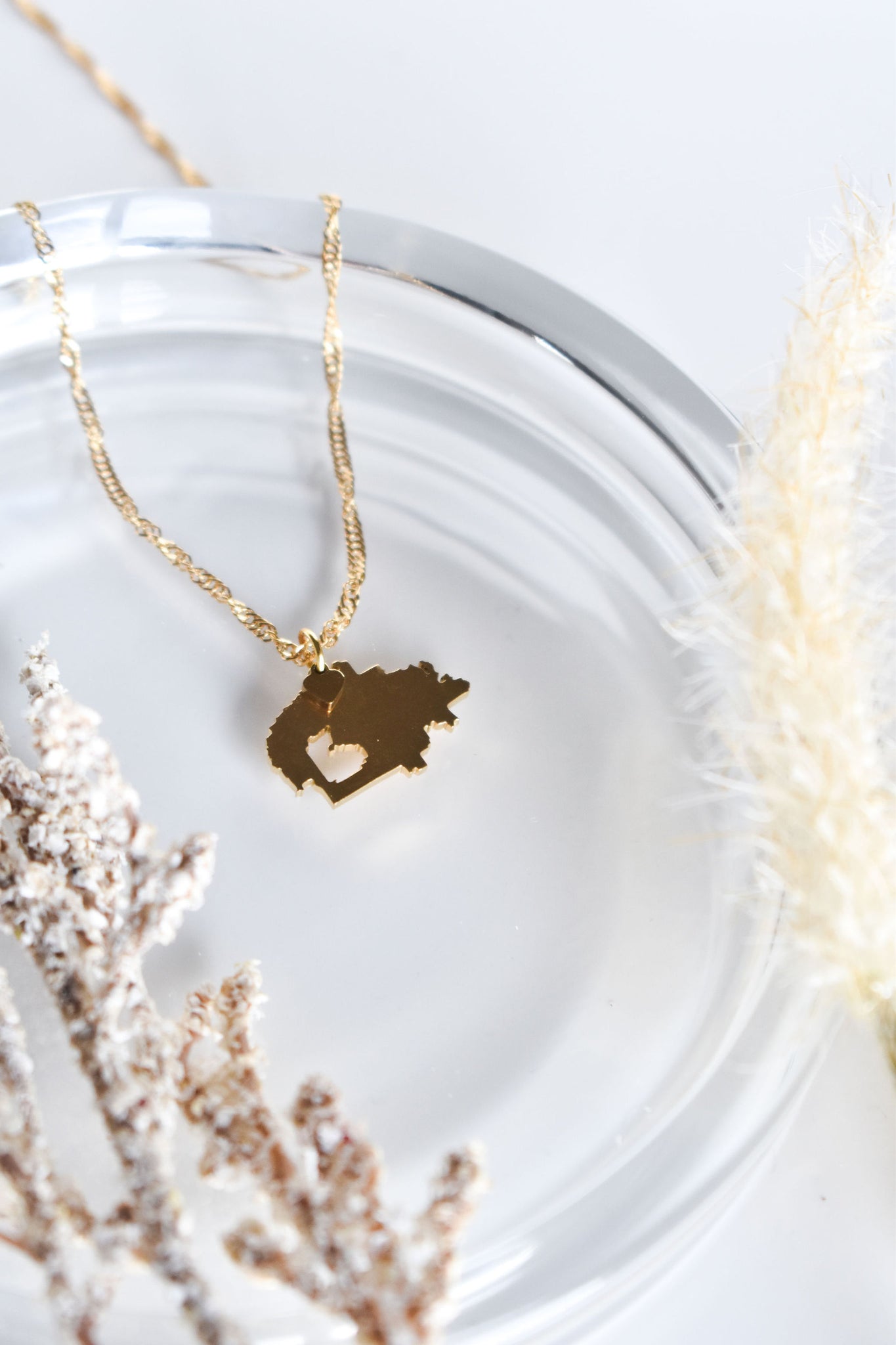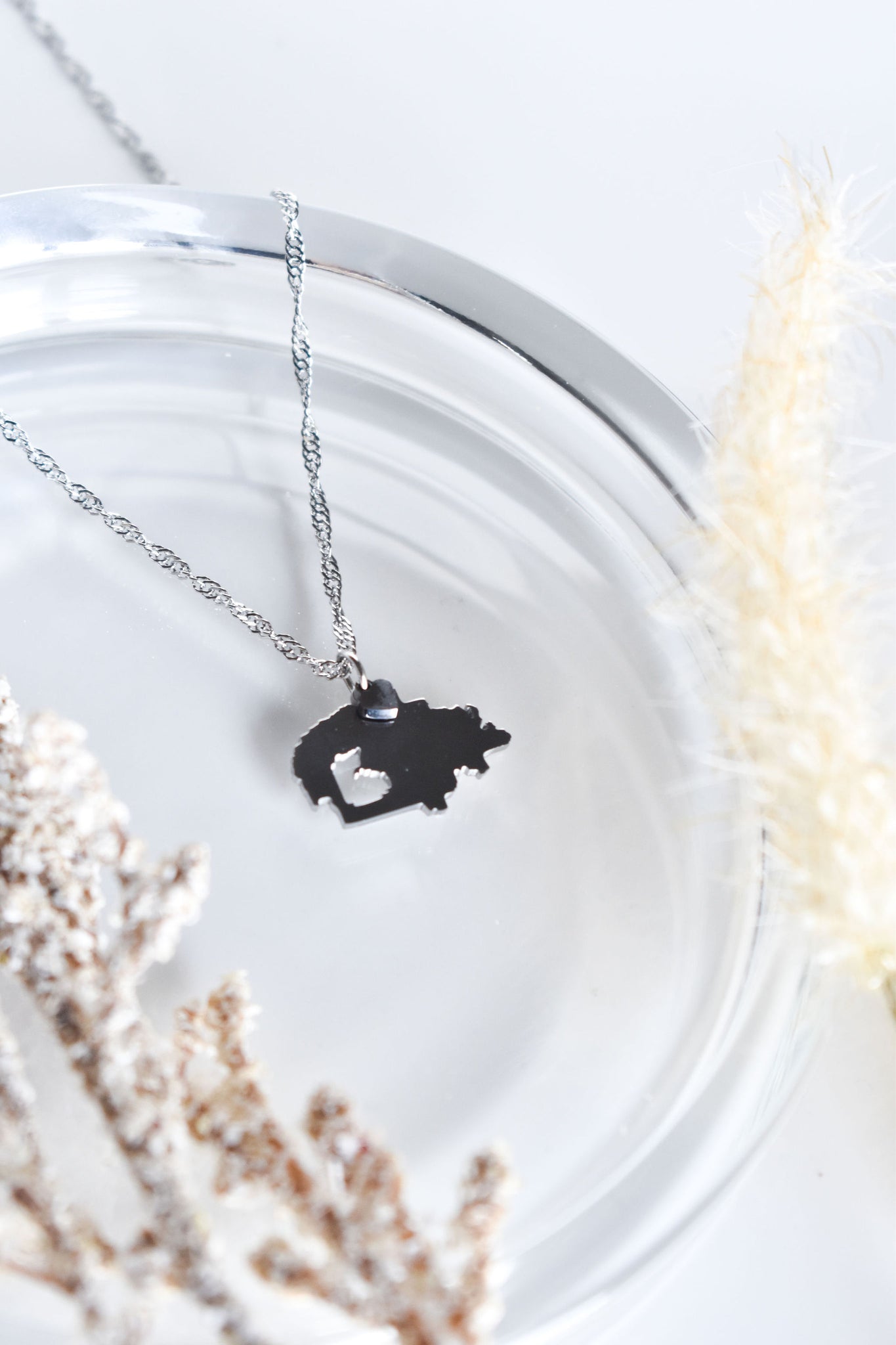 A beautifully crafted pendant in the shape of Navajo Nation, with a delicate heart gracefully suspended from the top. Accompanied by a stunning spiral-patterned chain in your choice of color, this elegant piece is designed to symbolize your nationality, culture, or a place that holds a special place in your heart.