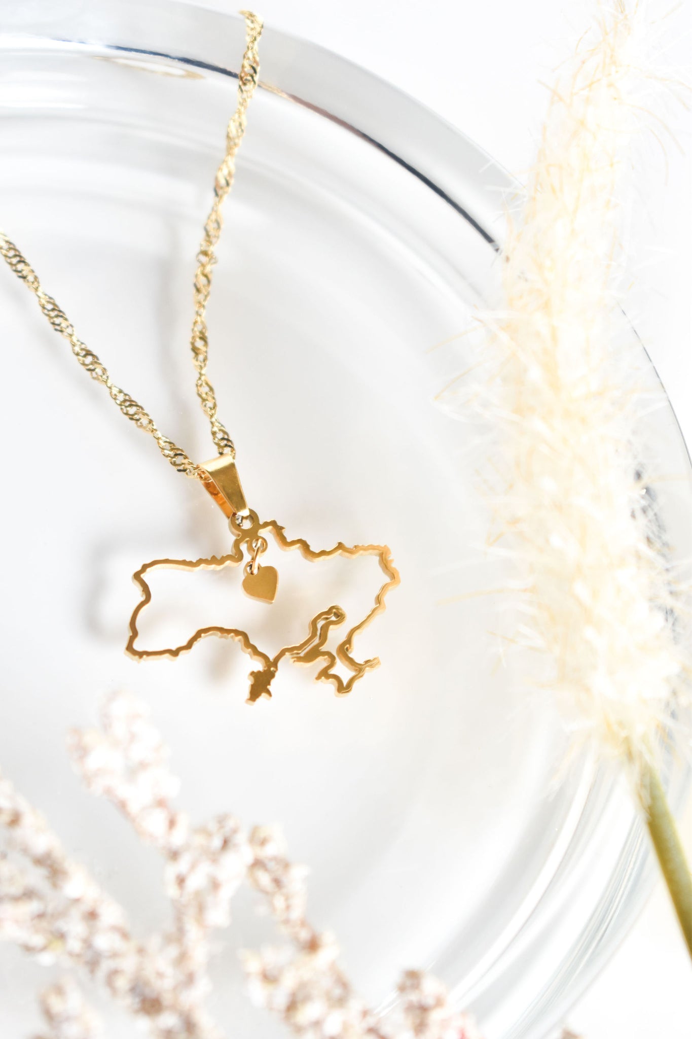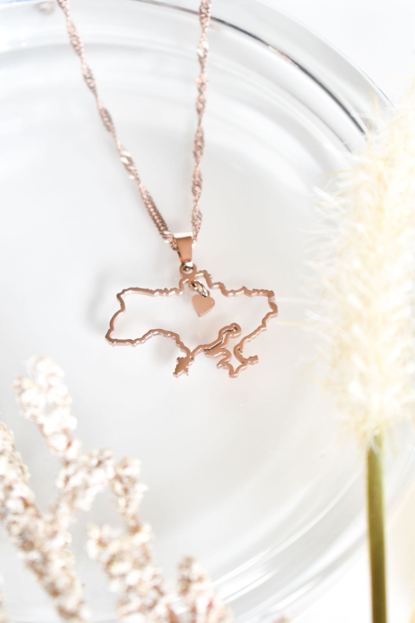 A stunning Ukraine country-shaped outline pendant featuring a delicate, dangling heart at its center. Paired with an elegant spiral-patterned chain, both the chain and pendant come in matching colors of your choice, creating a beautifully cohesive and customizable accessory complementing both dressy and casual looks. Thoughtfully designed to be truly unique, this piece symbolizes your nationality, culture, or even a place that holds a special place in your heart.