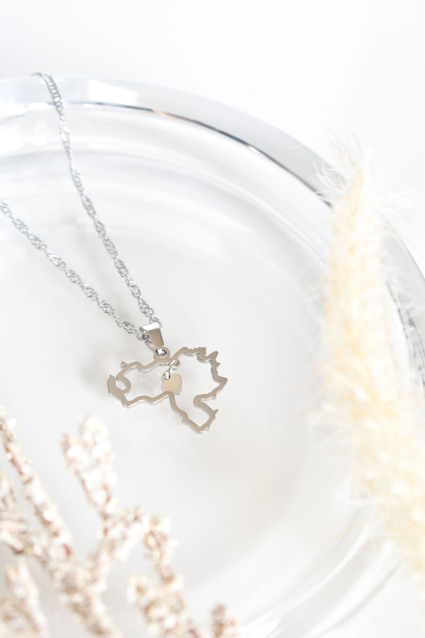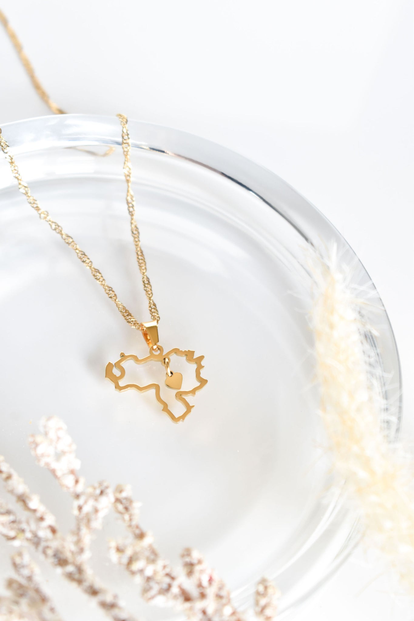 A stunning Venezuela country-shaped outline pendant featuring a delicate, dangling heart at its center. Paired with an elegant spiral-patterned chain, both the chain and pendant come in matching colors of your choice, creating a beautifully cohesive and customizable accessory complementing both dressy and casual looks. Thoughtfully designed to be truly unique, this piece symbolizes your nationality, culture, or even a place that holds a special place in your heart.