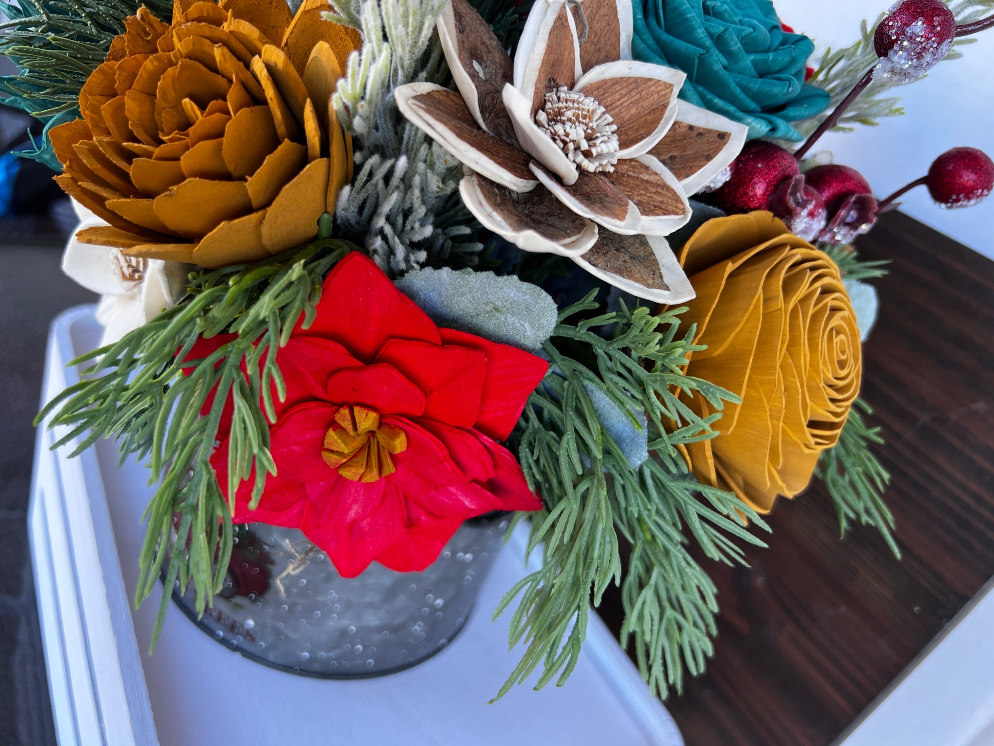Expertly crafted holiday arrangement with hand painted sola wood flowers and abundant greenery, arranged in a durable metal container featuring a festive red truck design. Perfect for adding a rustic touch to your Christmas decor.