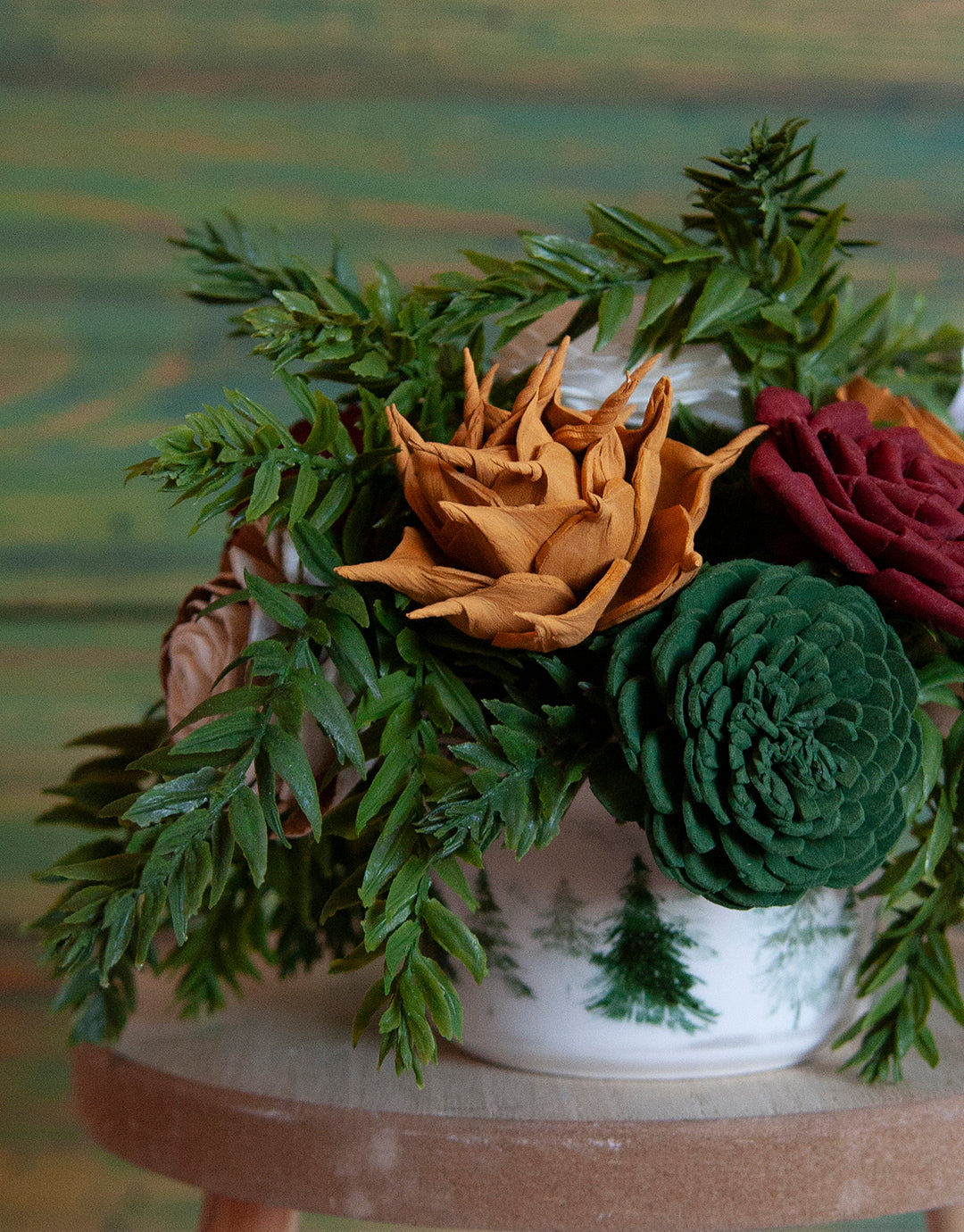 Experience the beauty and charm of our hand painted sola wood flower arrangement. The delicate flowers and vibrant greenery are arranged in a white crock, with whimsical trees adding a touch of nature to your space. Elevate your decor with this unique and long-lasting centerpiece.
