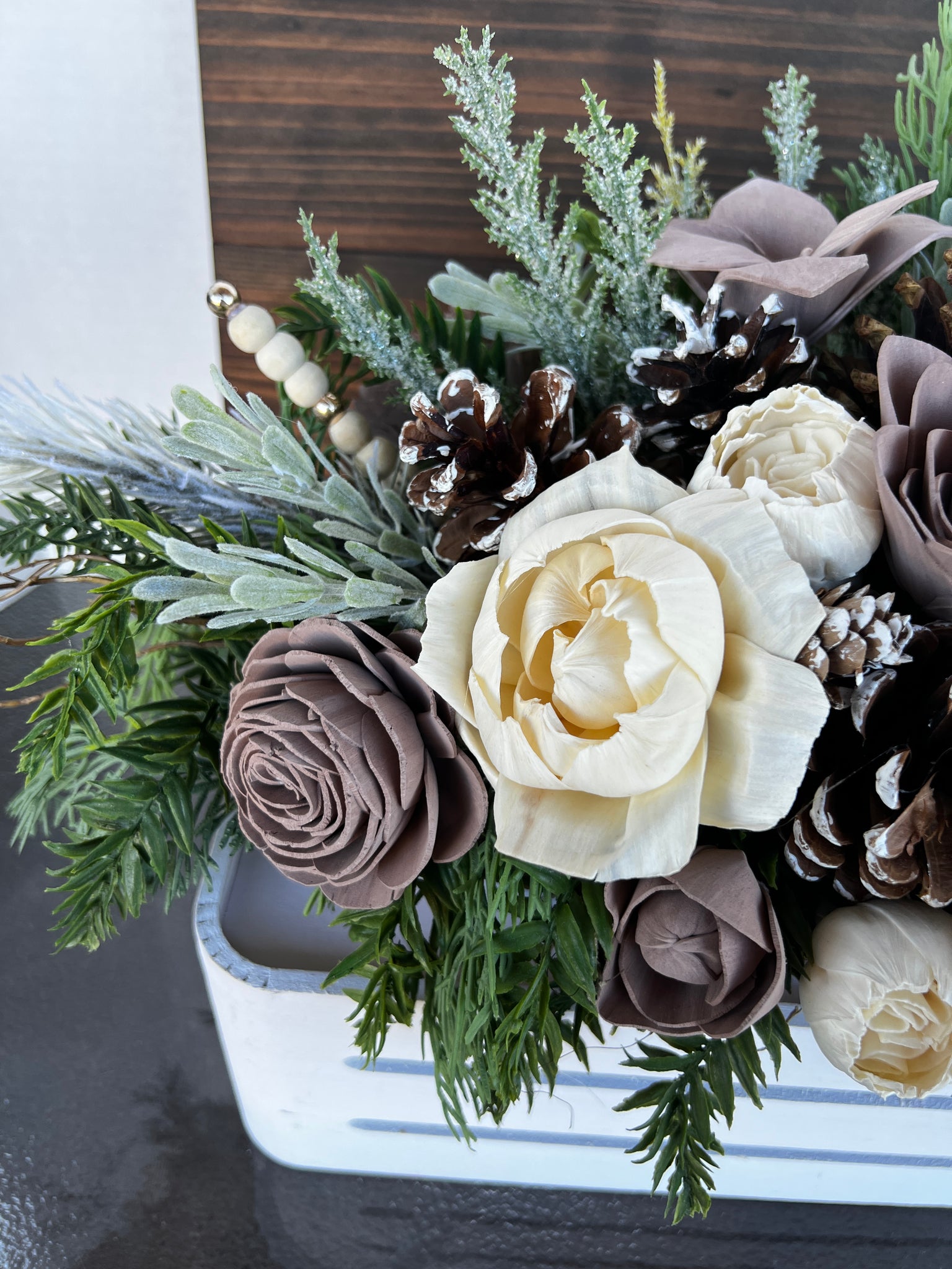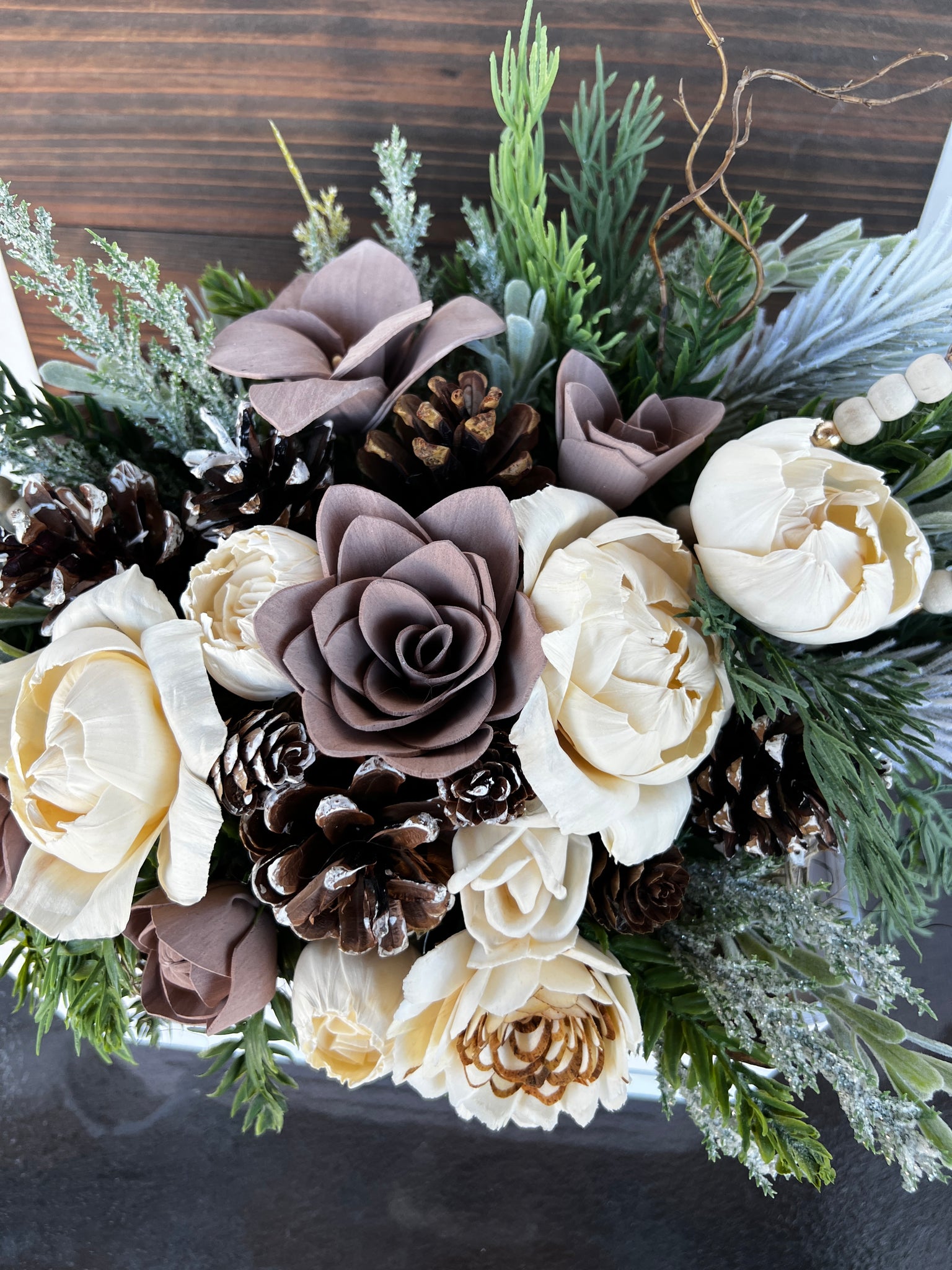Expertly arranged with hand-painted sola wood flowers and rustic greenery, this holiday arrangement is a grand addition to any festive decor. Featuring a very large size and pine cones, all nestled in a unique reclaimed bread bowl, this arrangement is both beautiful and environmentally-friendly.