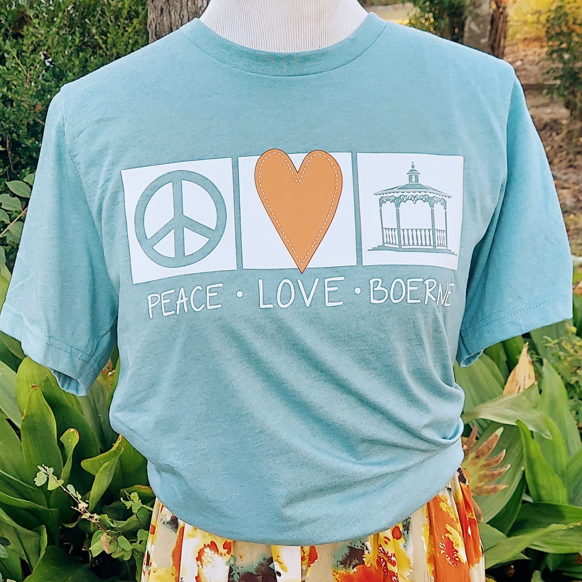 Peace love Boerne tee.  Super soft Bella + Canvas shirt.  Generic/Men’s sizes in XS to XXL.