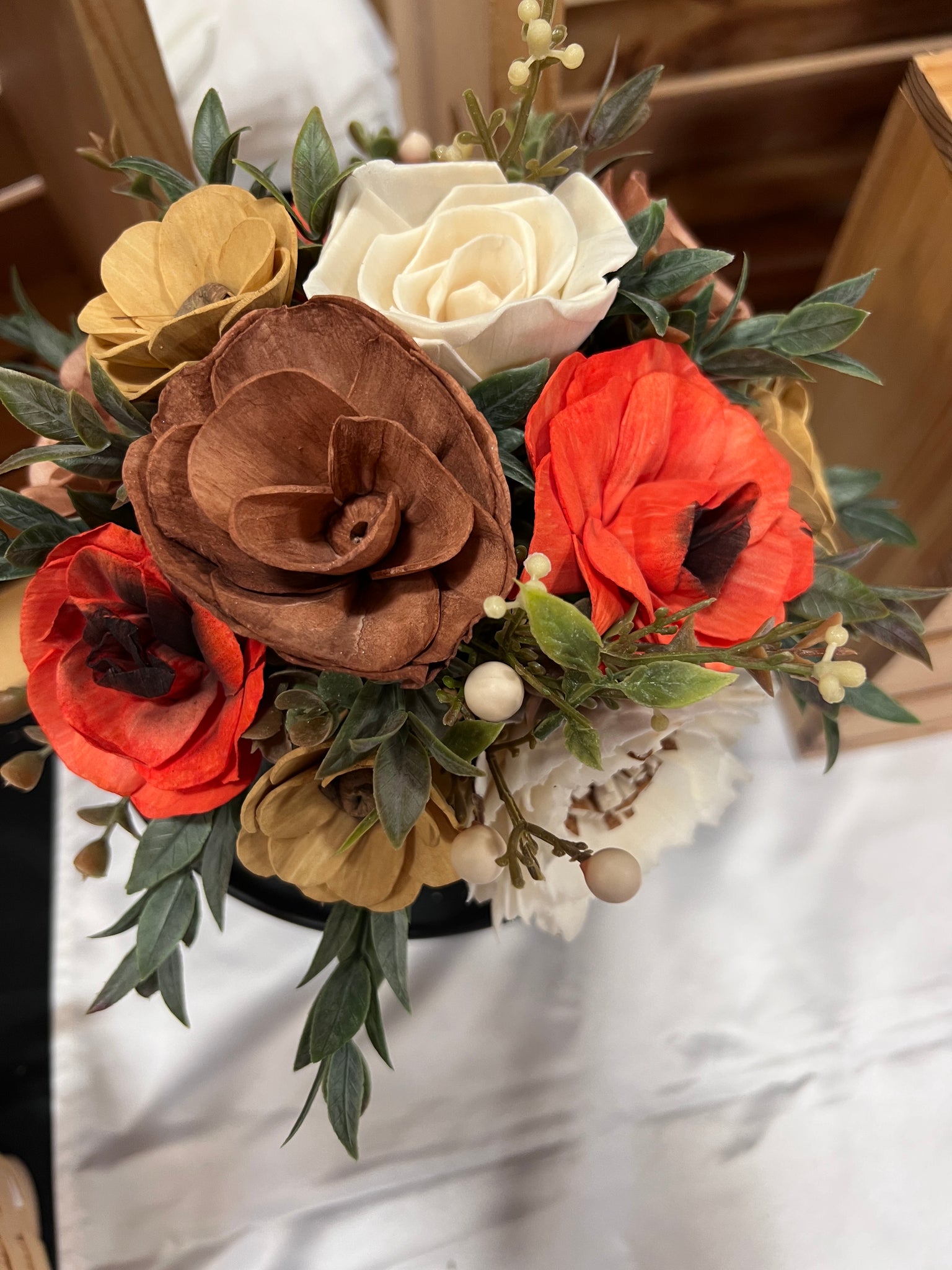 Expertly crafted by hand, these large Sola Wood succulent flowers bring a touch of nature to any space. Each piece features hand painted flowers and greenery, artfully arranged in a vintage gold pitcher adding a natural and rustic charm to your home.