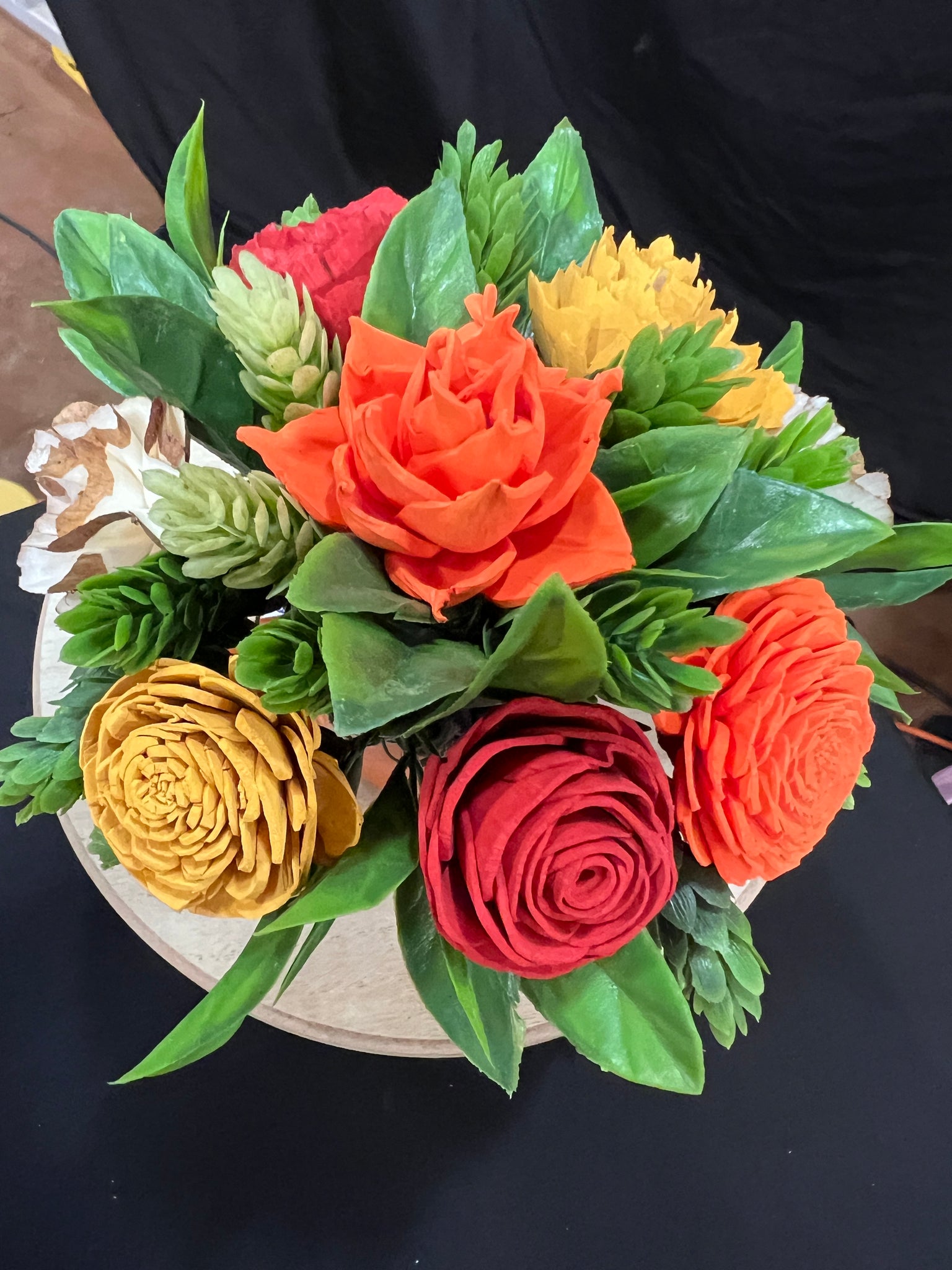 This cute little sola wood arrangement contains hand painted sola wood flowers and greenery all arranged in a ceramic cup