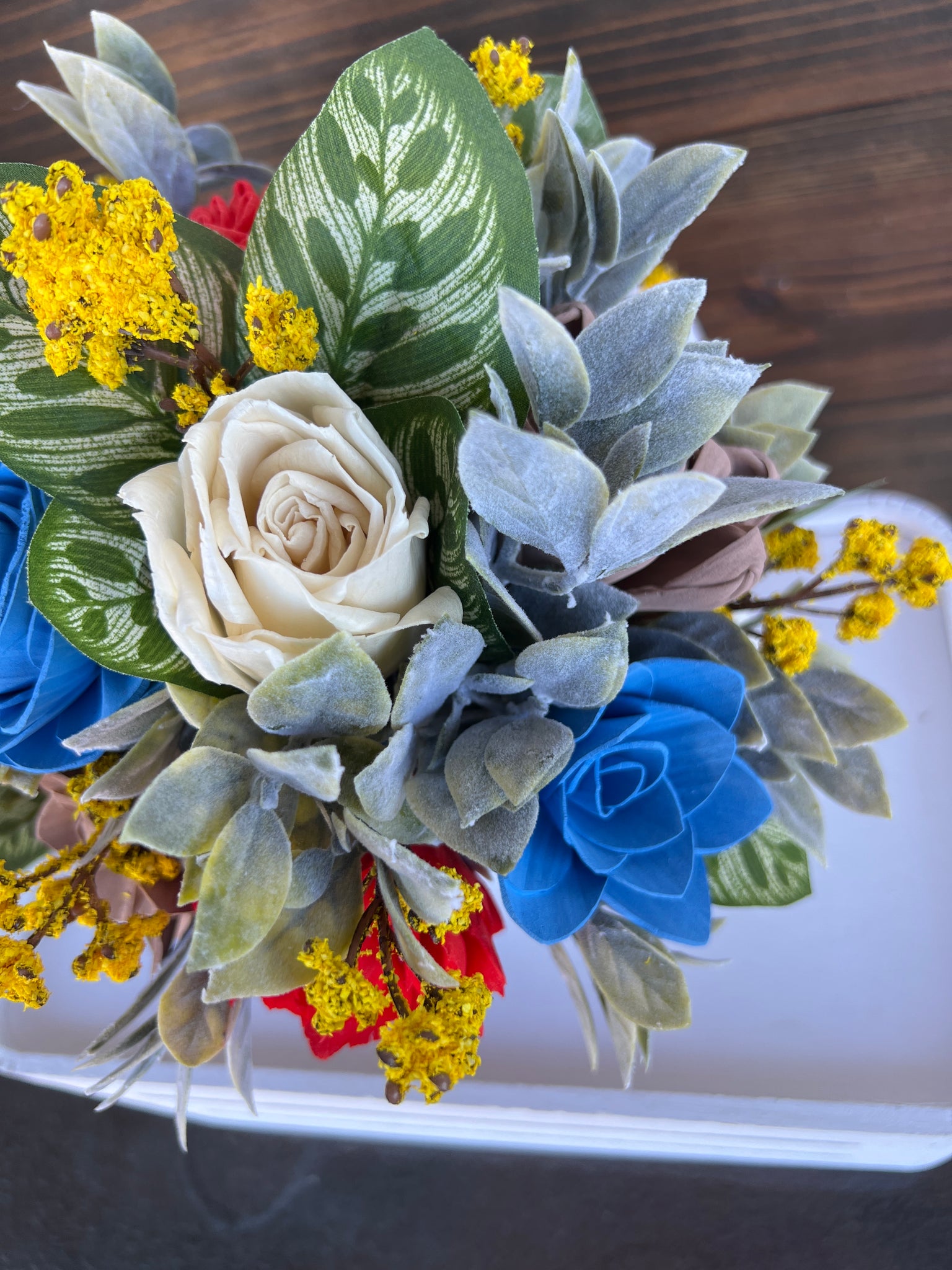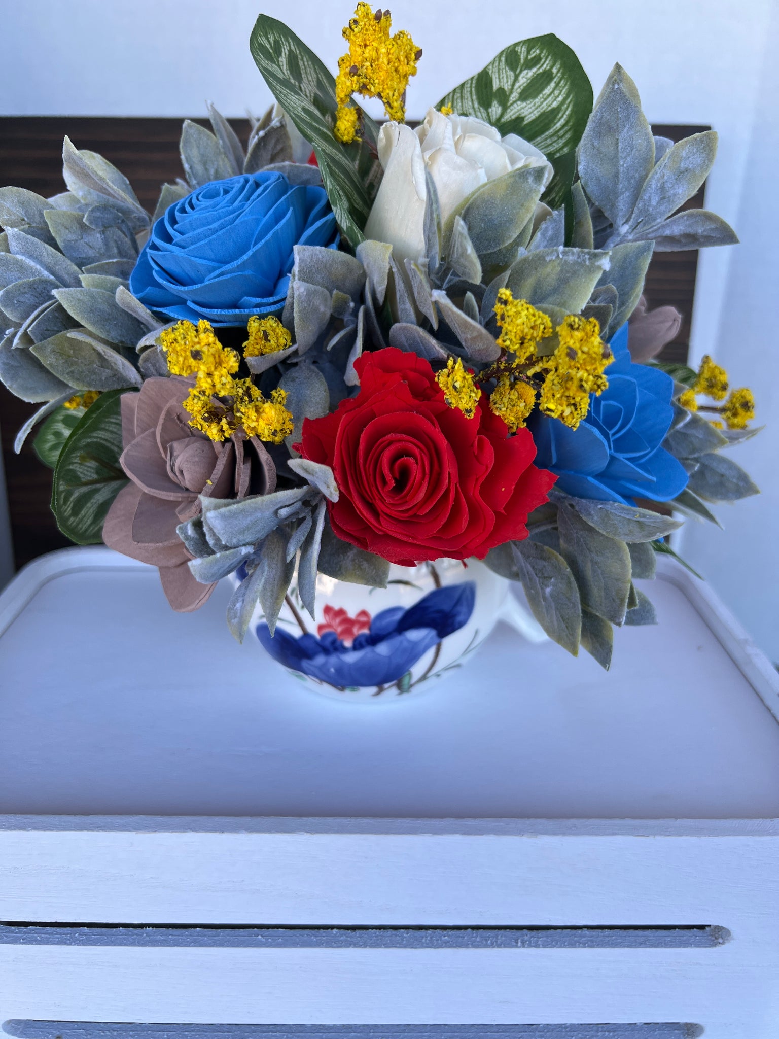 Elevate your home decor with our Sola Wood flowers in tea pot. Each flower is handpainted, adding a unique touch to every upcycled tea pot. Bring nature indoors with this sustainable and beautiful centerpiece.