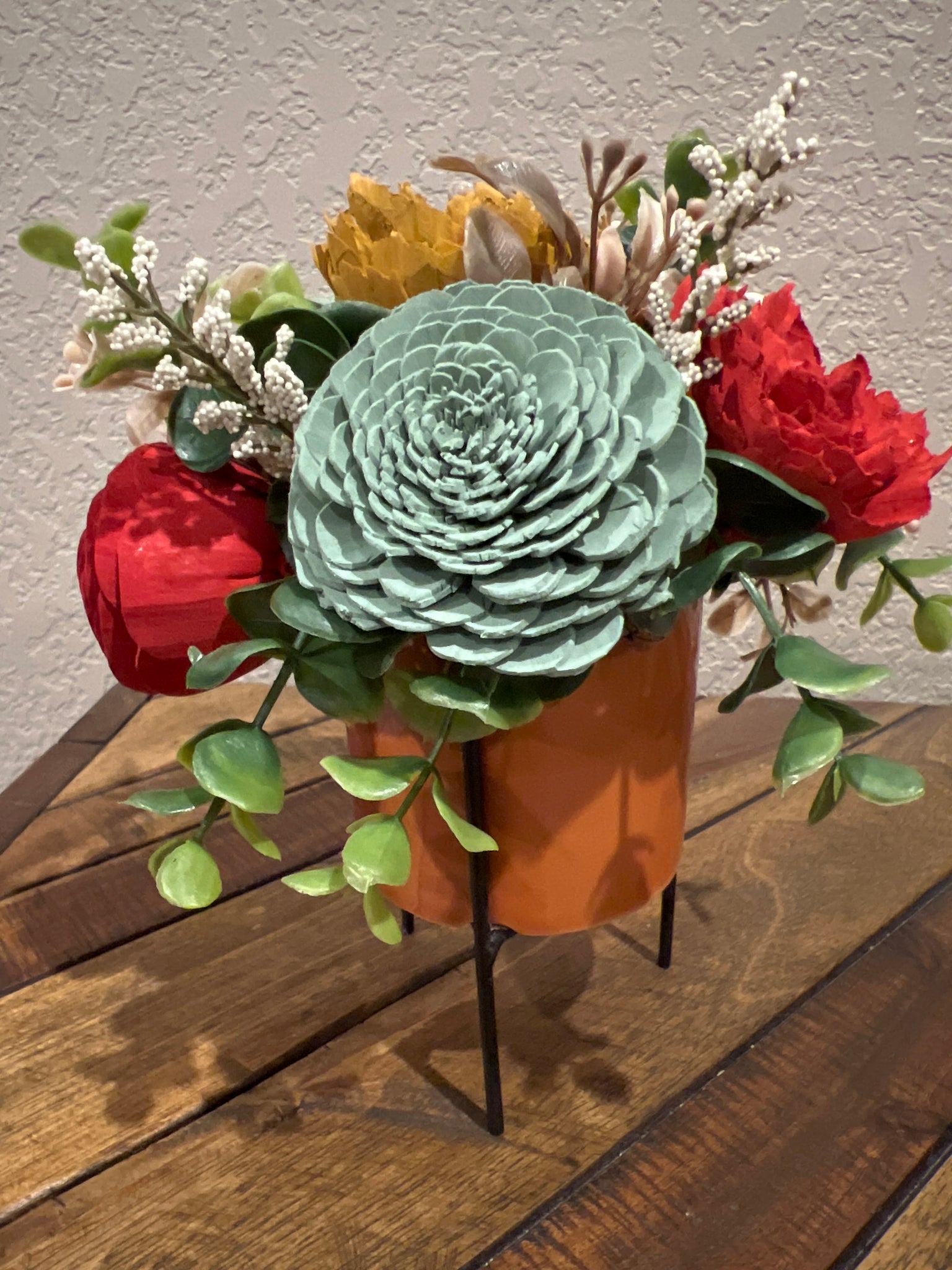 This cute little sola wood arrangement contains hand painted sola wood flowers and greenery all arranged in a orange ceramic cup and black stand