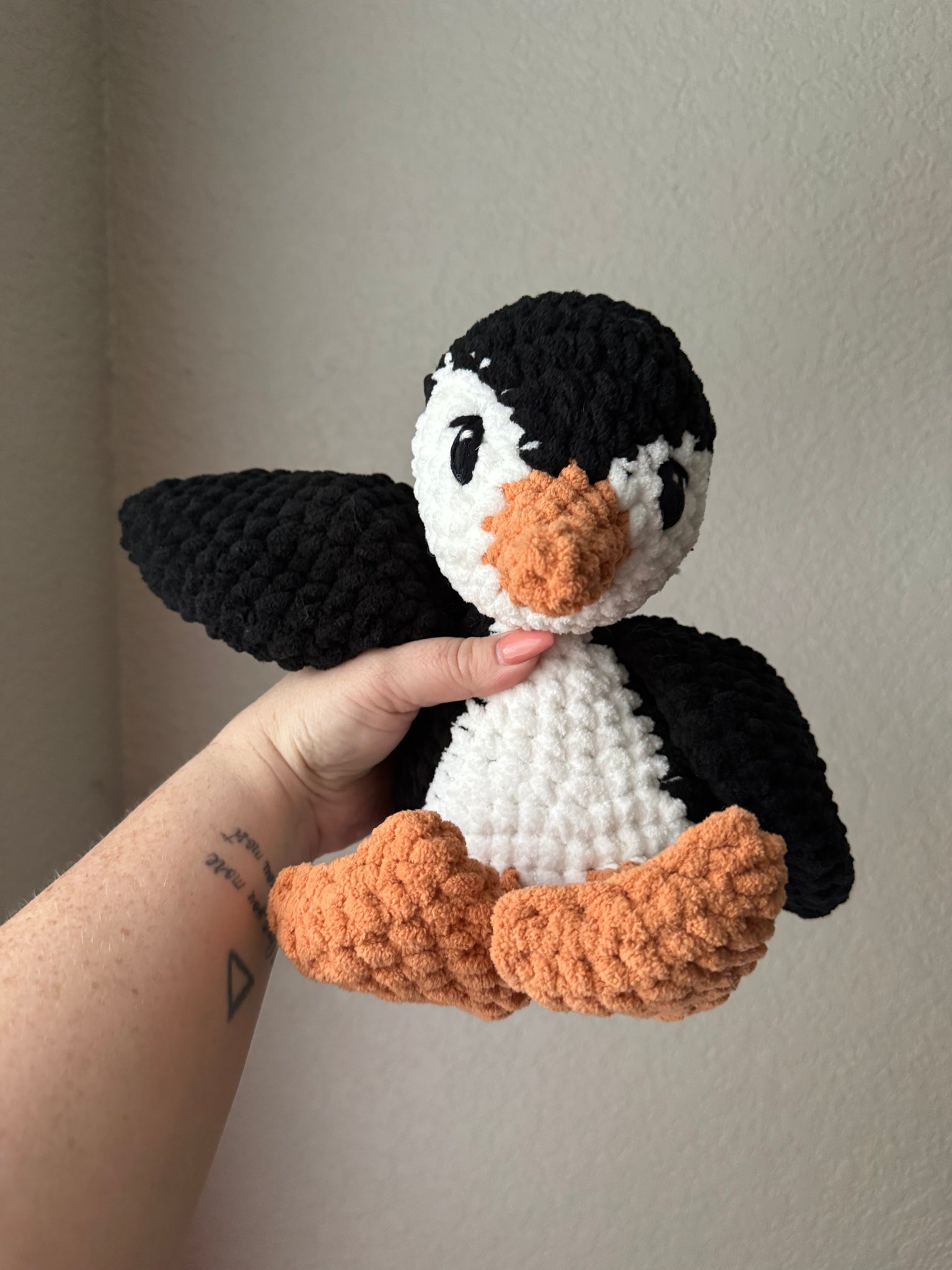 Approximate 12 inch penguin plushie with embroidered eyes and floppy legs