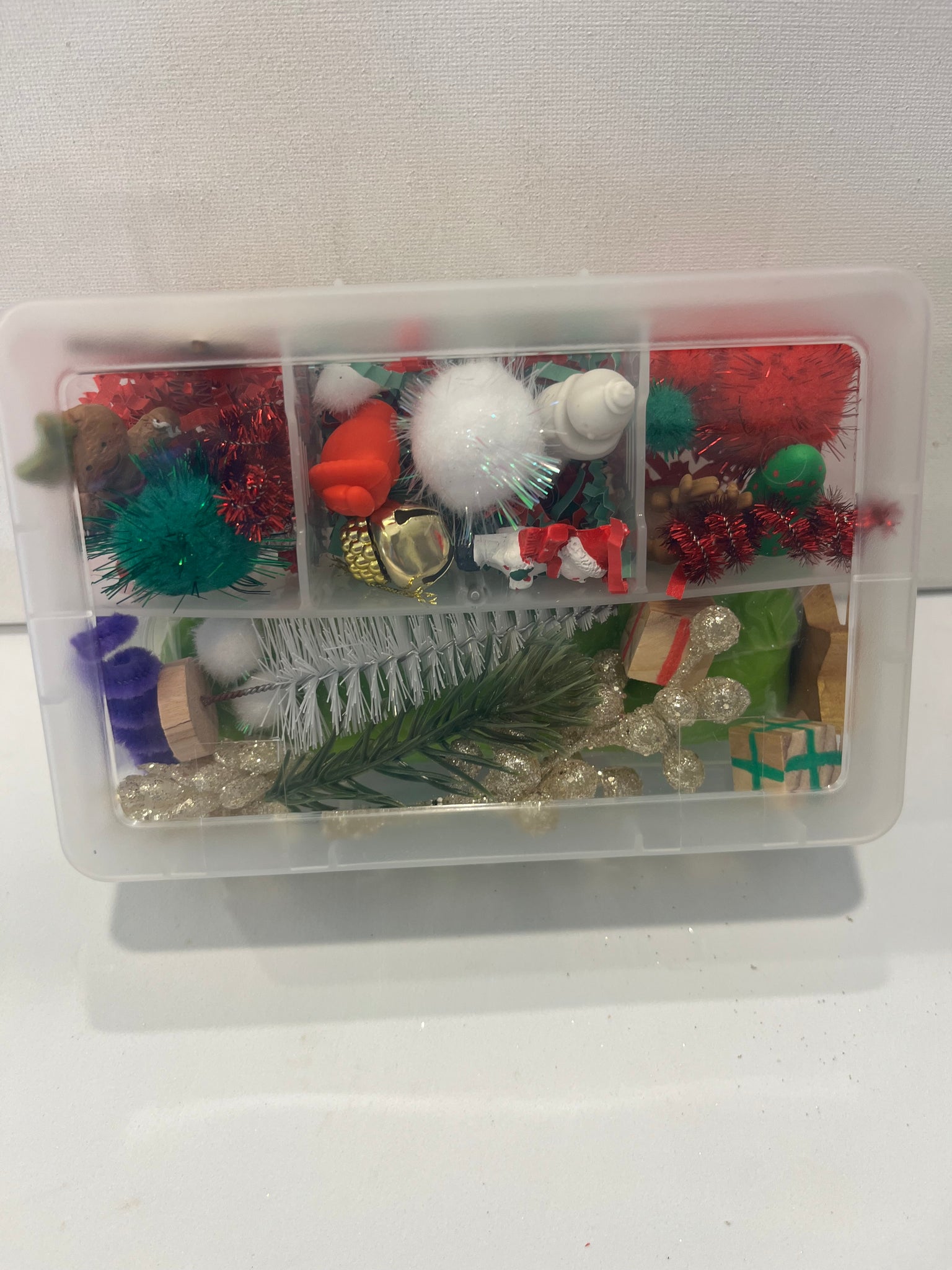 Christmas themed items: tree, presents, gingerbread man, snowman, raindeer face, icicyle, pom-poms, etc.